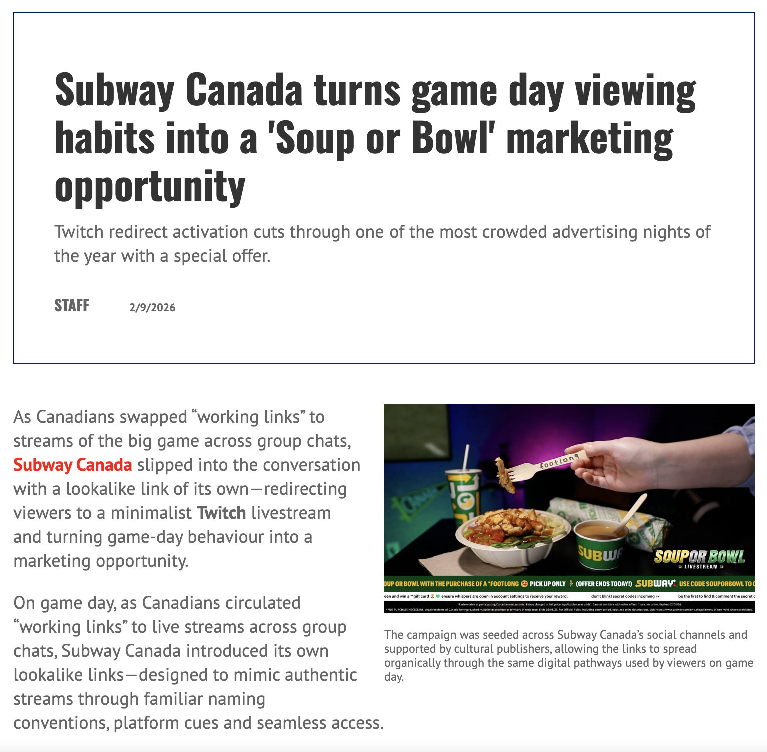 We snuck into 26 subreddits where fans were hunting for links to the big game and shared one of our own. Instead of football, anyone who clicked was redirected to Subway’s Soup or Bowl livestream on Twitch, a game-length broadcast featuring a Power Bowl, a soup, and a live offer for 60% off soups or bowls. To reward viewers who stuck around, surprise gift cards were revealed throughout the stream using secret code words.