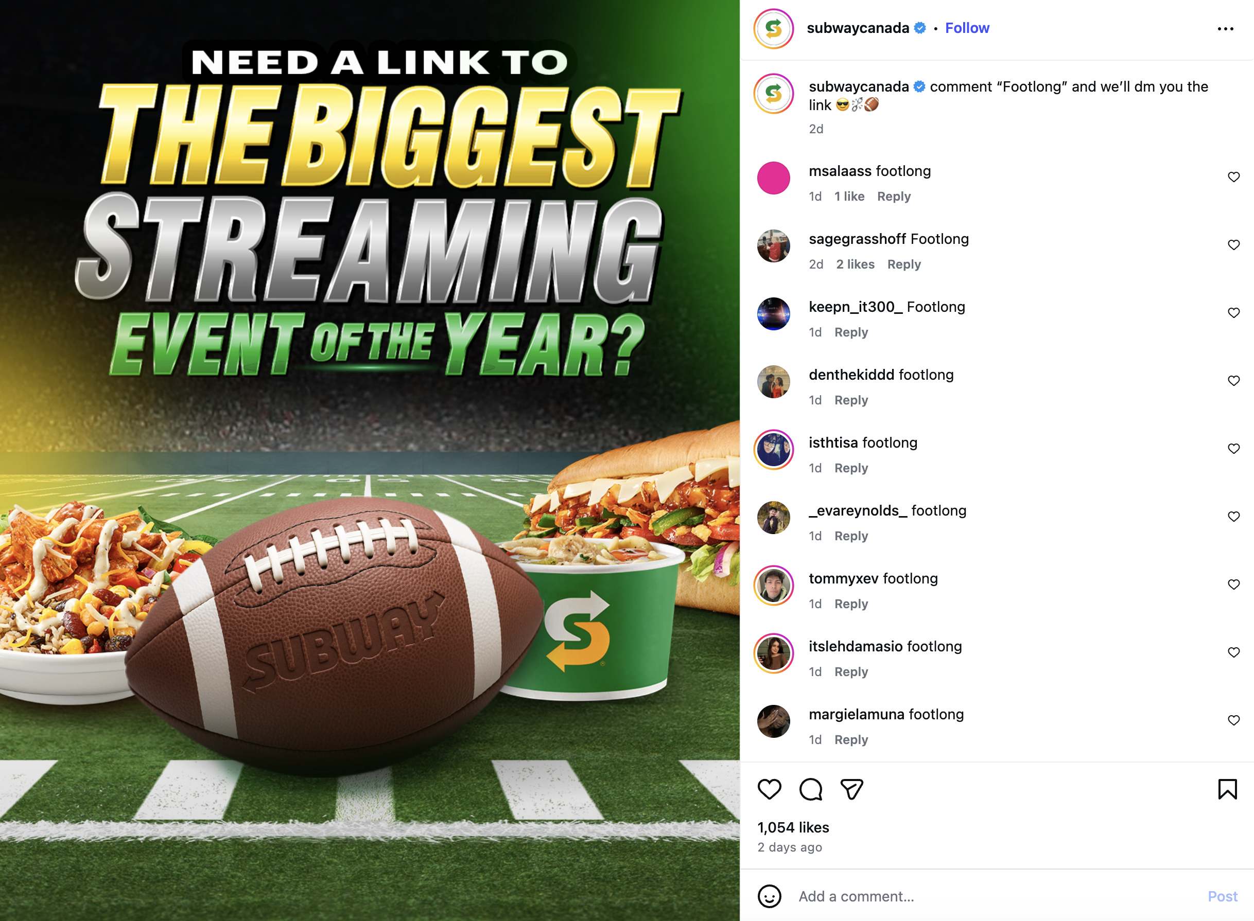We hinted that Subway had a link to the big game. (I’d believe that.) Using ManyChat, anyone who commented “Footlong” received a DM with the Twitch stream, resulting in an almost perfect click-through rate.